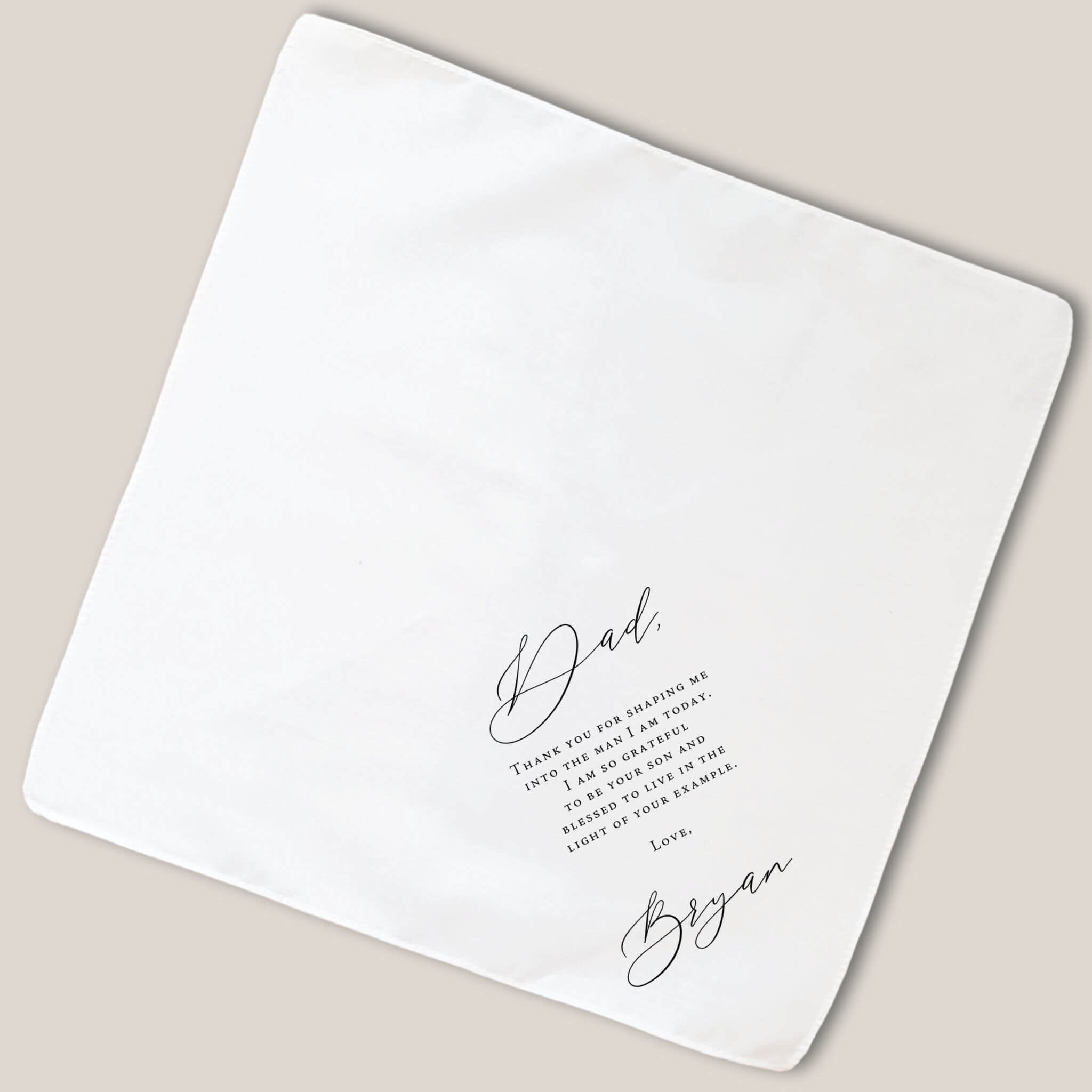 Personalize this white cotton men's handkerchief with a message in black ink from the groom to his father.  The message allows you to say it all with one simple gesture, thanking him for his ongoing support and for shaping you into the man you are today.