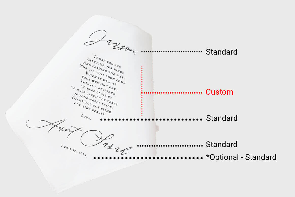 Make your special day even more memorable with a classic ring bearer personalized handkerchief. This lovely wedding gift is perfect for a special little boy who will be honored to carry the rings down the aisle. Its soft and luxurious feel will ensure that it looks beautiful and can be treasured forever. The personalized touches of his name, wedding date, or any phrase you wish make this an extra-special keepsake. And its classic look ensures it will never go out of style!