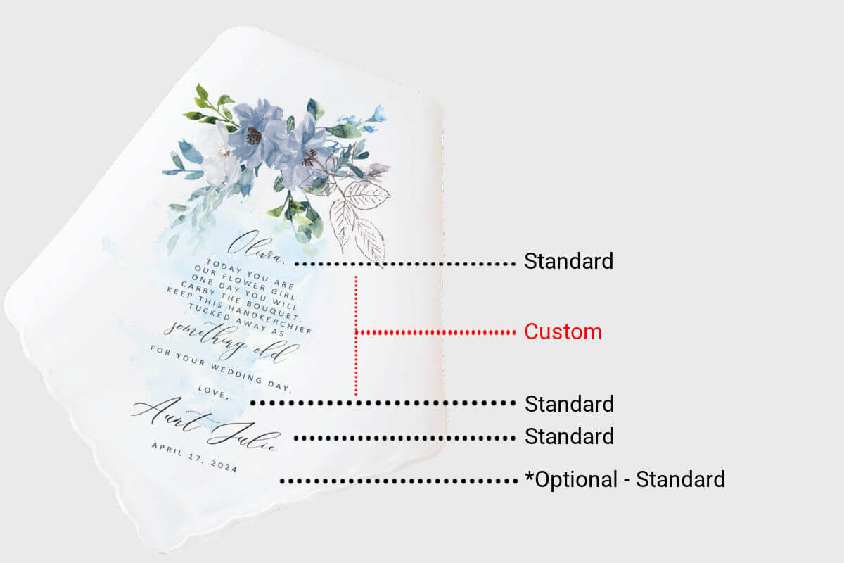 This personalized handkerchief is the perfect gift for your flower girl on your special day. Made of soft cotton, it can serve as a wedding keepsake and "something blue" for the little girl. Show your appreciation and make her feel special with this unique and thoughtful present.