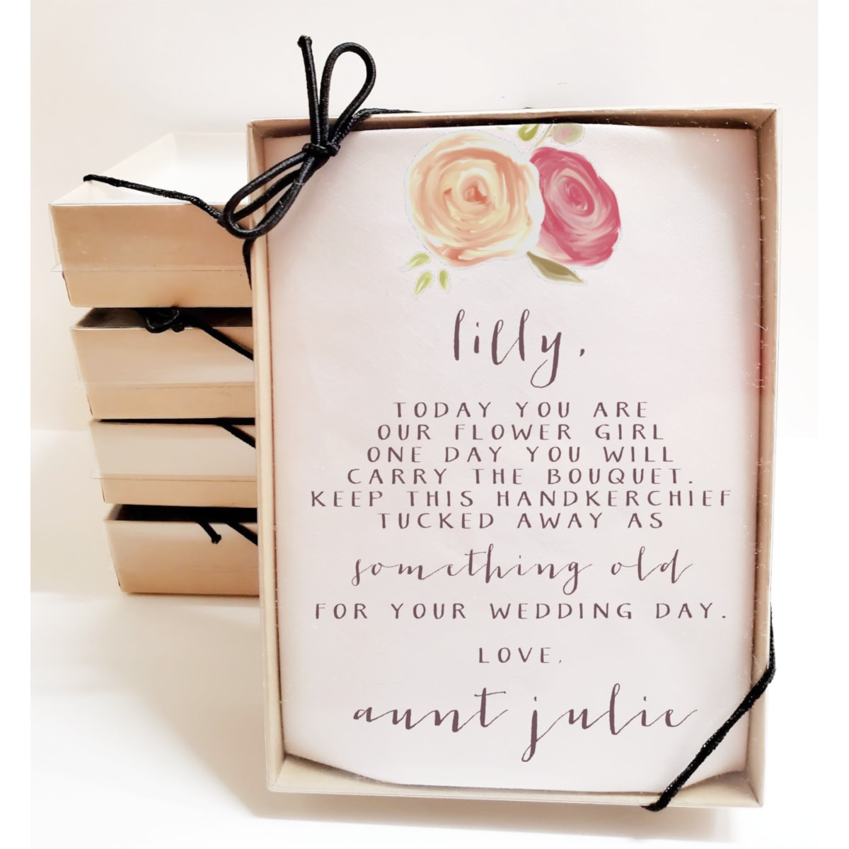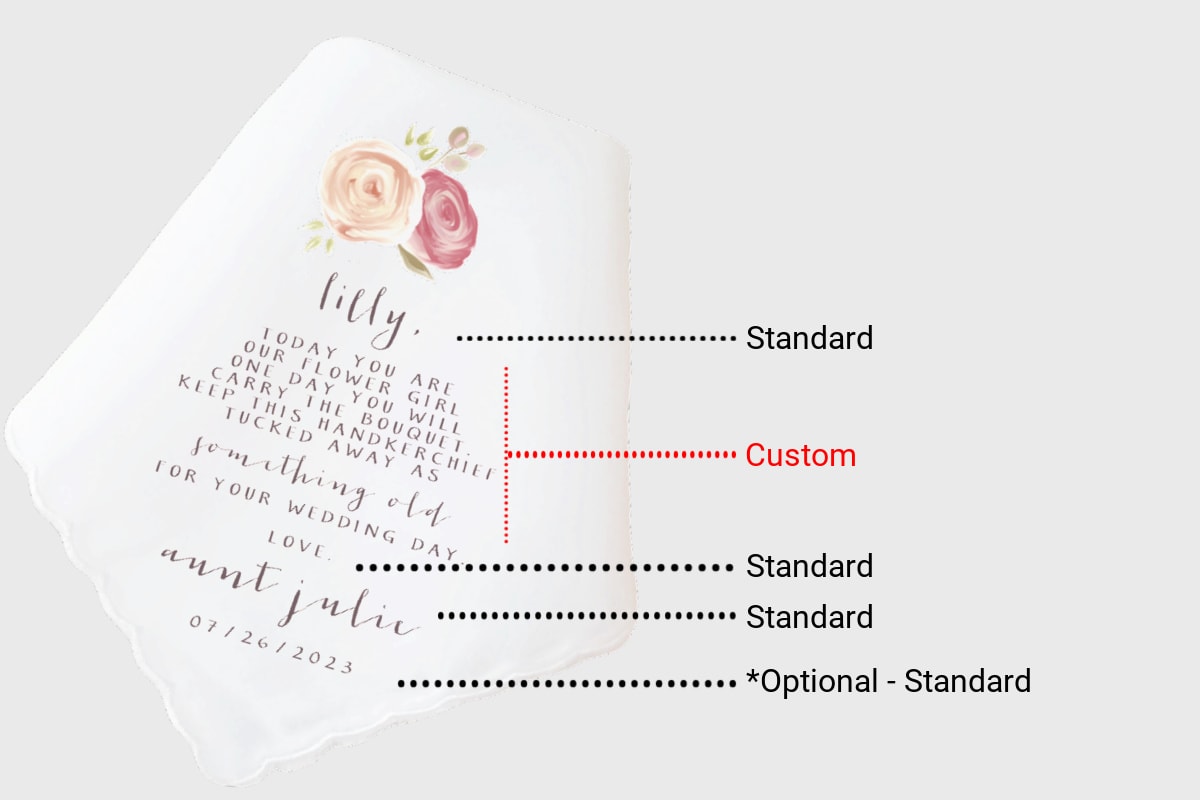 The Tea Rose Flower Girl Handkerchief is the perfect wedding gift for the wedding couple to personalize and give to their flower girl on the wedding day.  Featuring soft pink and red floral with beautiful written poem in warm grey text.  This personalized handkerchief will make the perfect keepsake for the special girl in your life.