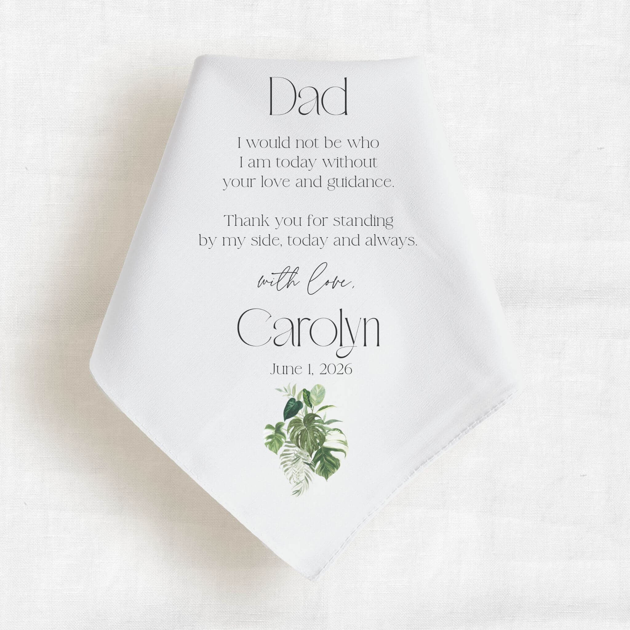 The daughter can personalize this men's handkerchief to her dad to make a unique wedding day gift. Featuring a green leaf graphic and a beautiful written poem in black text.