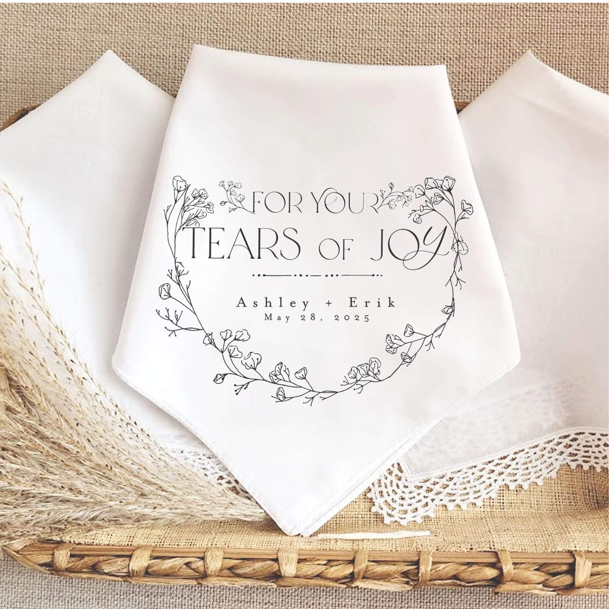 Customizable with the bride's name, groom's name, and wedding date, this elegant handkerchief also features the touching phrase "For your tears of joy" in classic black ink.