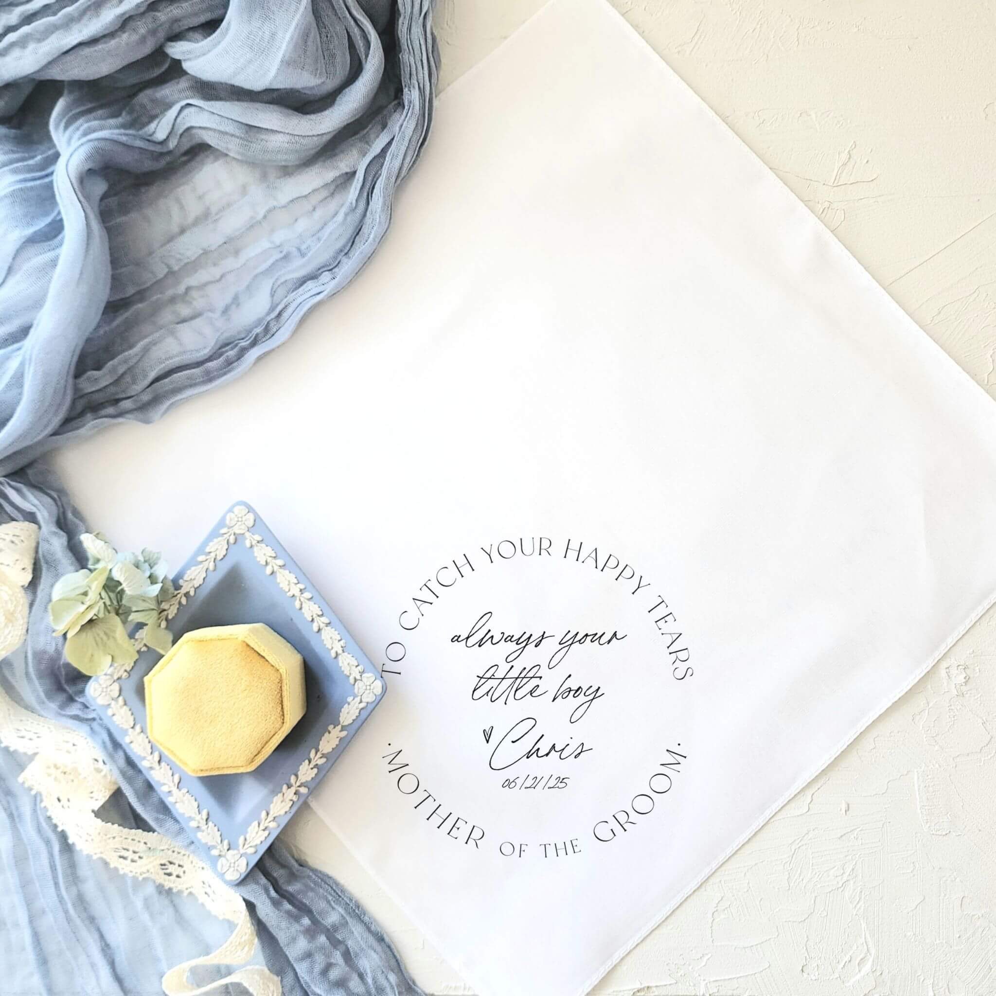 The Gwen Mother of the Groom Handkerchief is a special keepsake to show the love from the son to his mother. The handkerchief is personalized with the groom's name, wedding date, and includes the message "always your little boy".