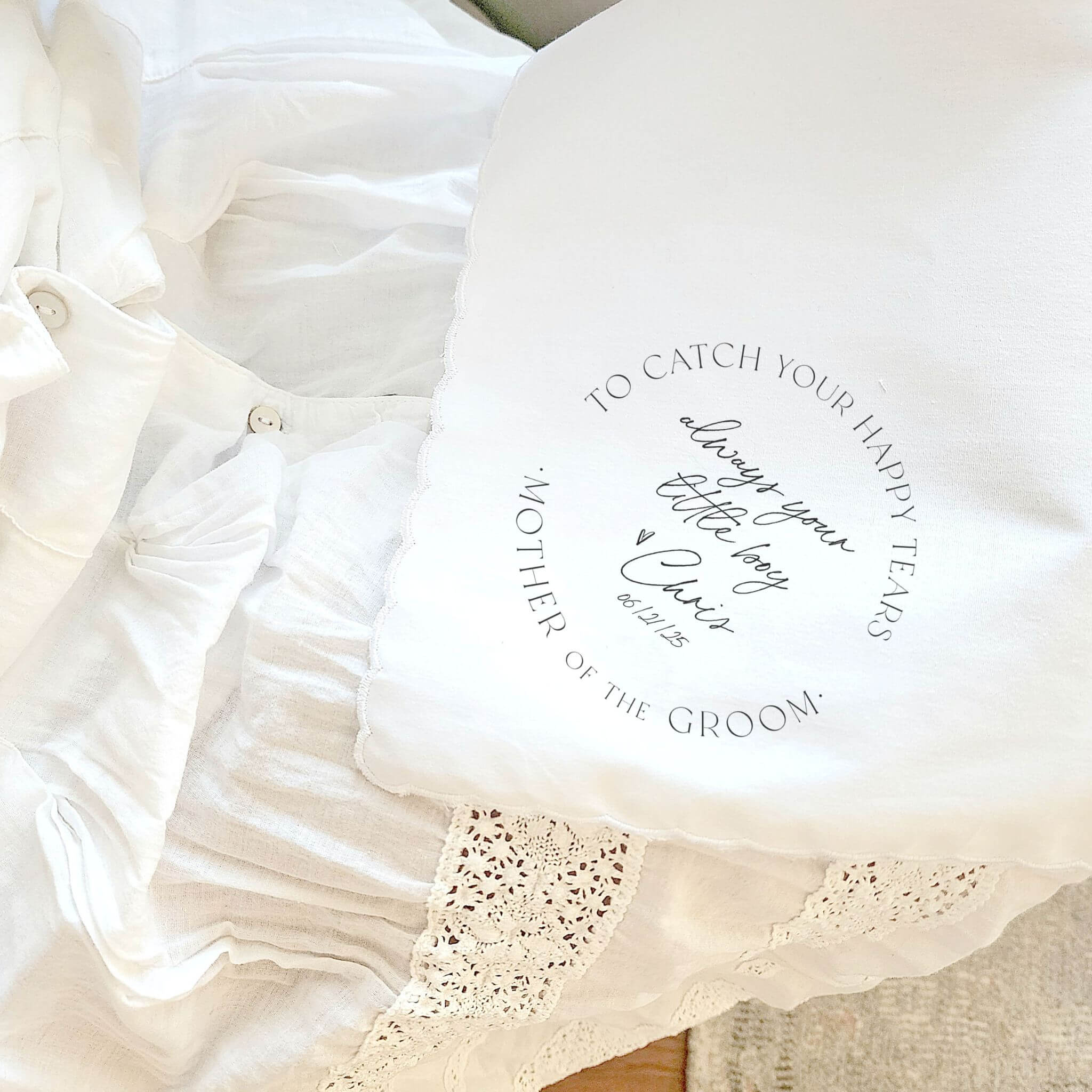 The specially selected handkerchiefs from The Polka Dotted Bee feature quality white cotton fabric that allows the personalized messages to be easily read by the gift recipient.