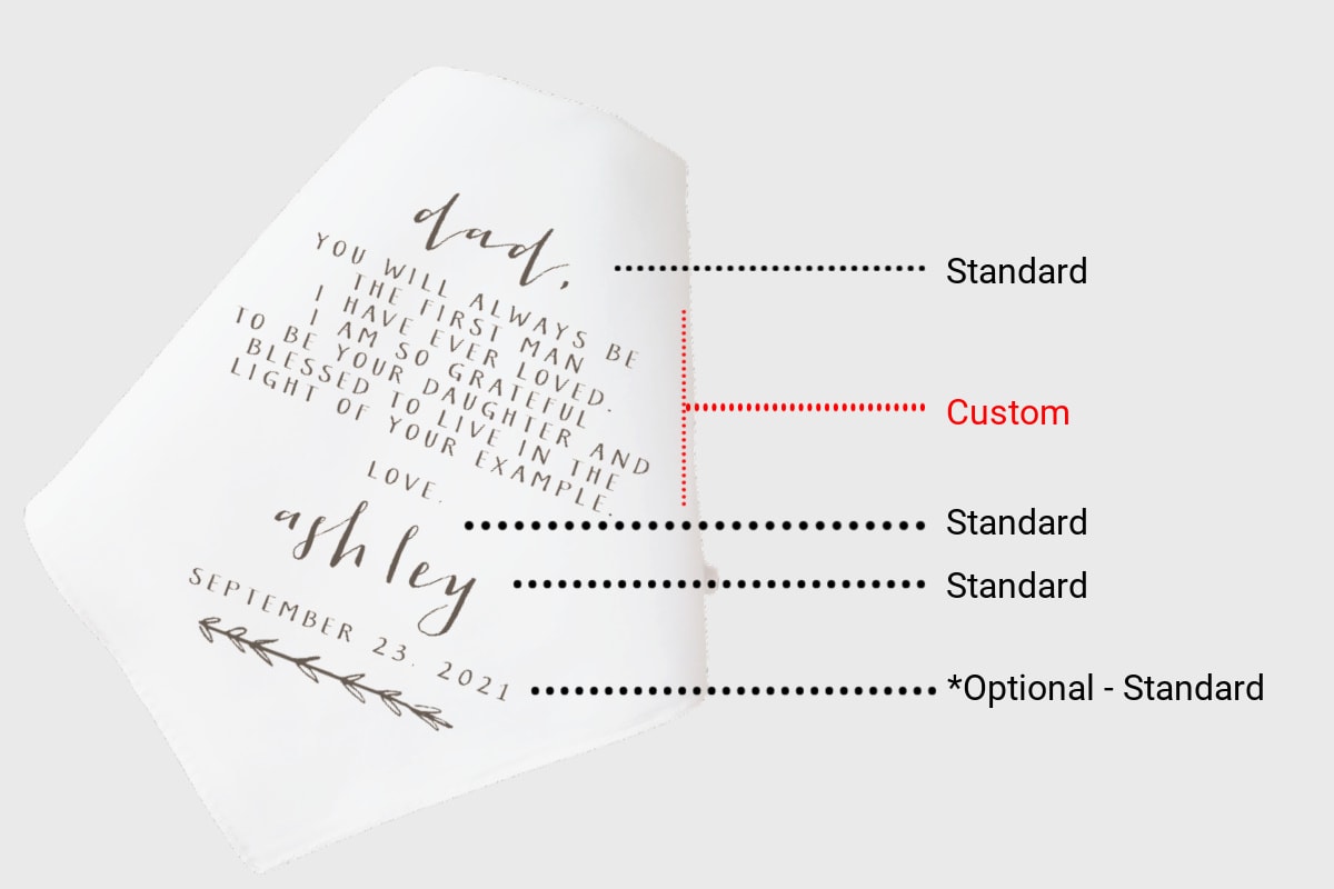 Personalize this father of the bride handkerchief to create the perfect wedding gift for the daughter to give to her dad on the wedding day. Featuring a simple branch and beautiful written poem in warm grey text.