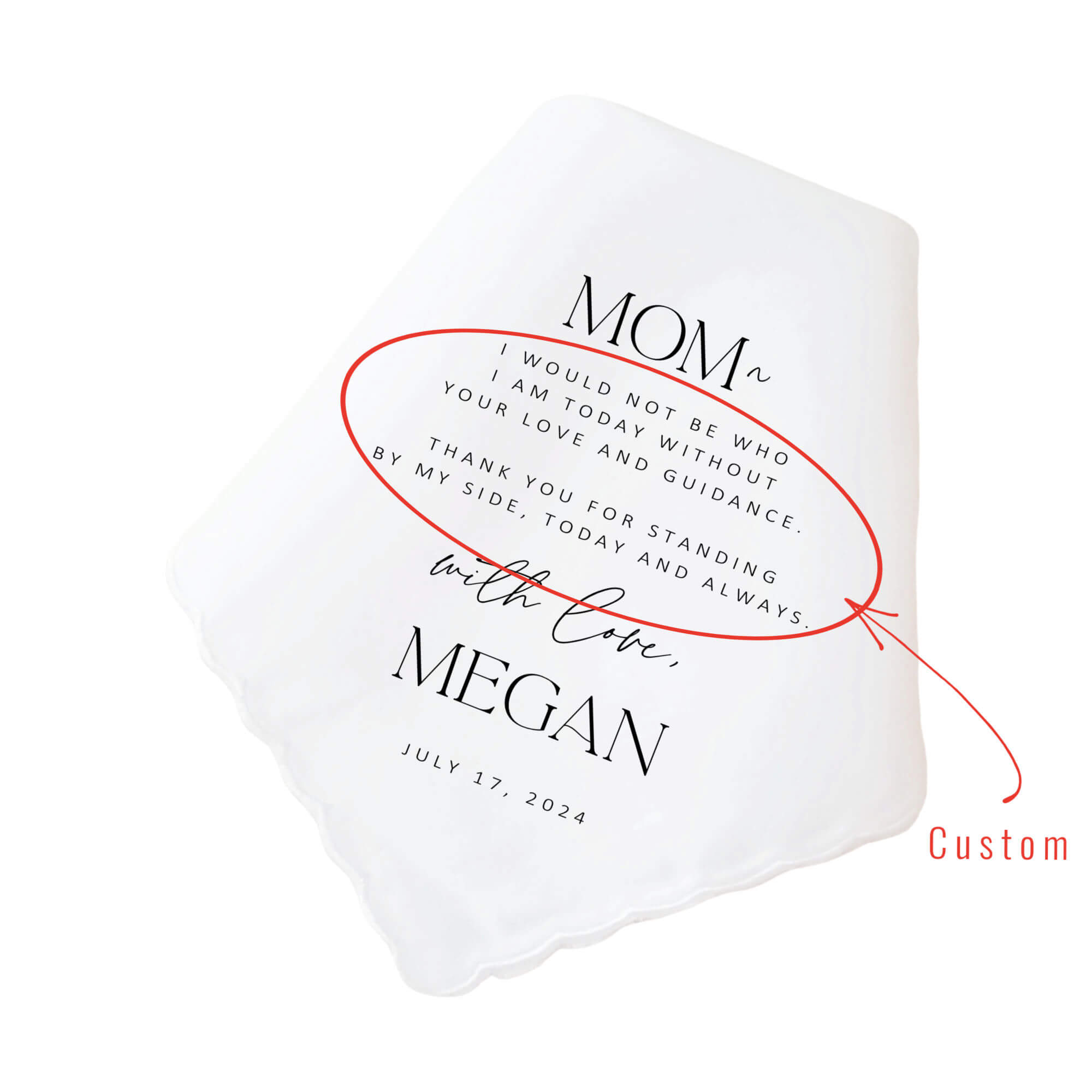 Elevate the special bond between mother and daughter with our mother of the bride handkerchief. Made from soft cotton, this wedding gift is a thoughtful gesture from the bride to her mother. Personalize with a custom message of love that will surely bring happy tears on the big day.