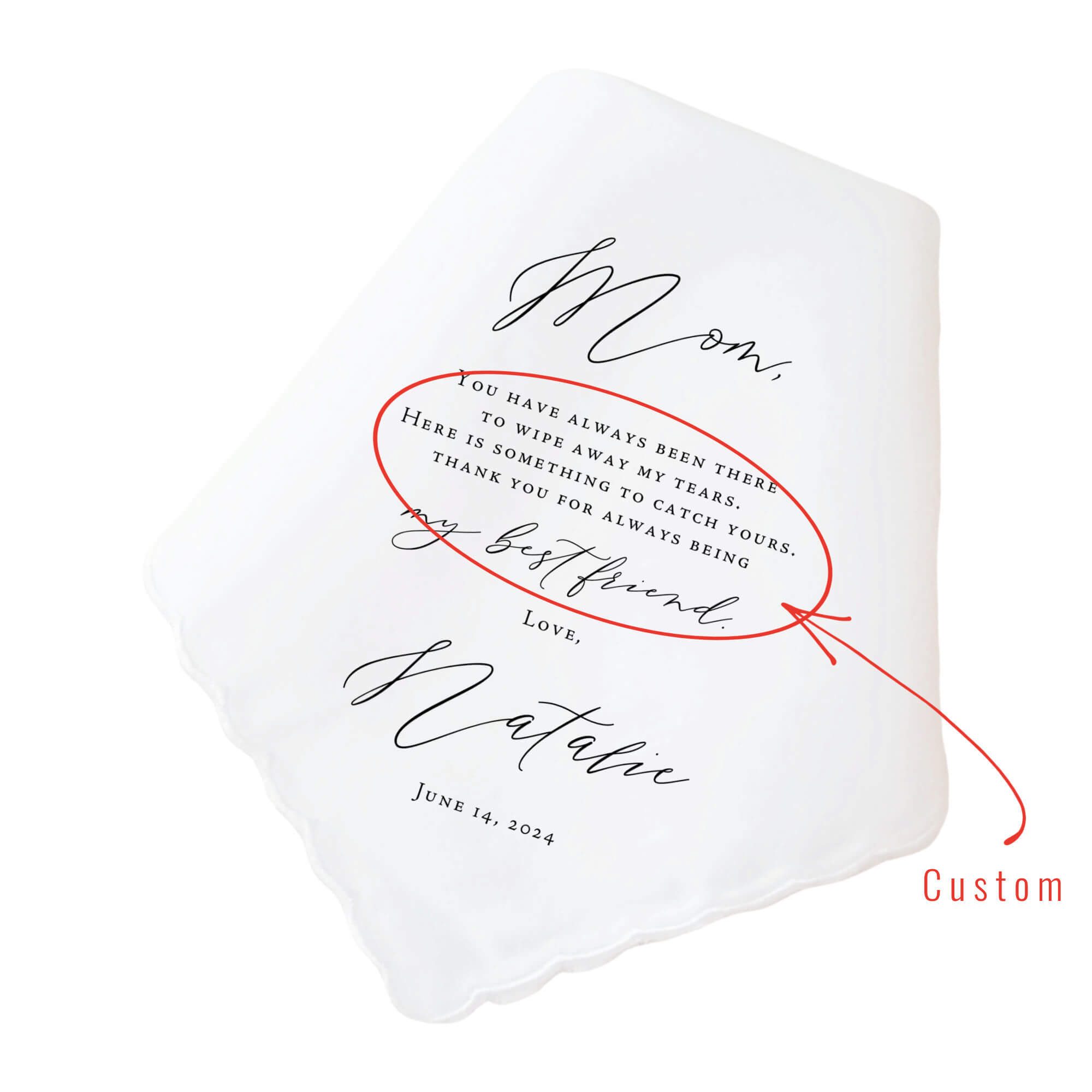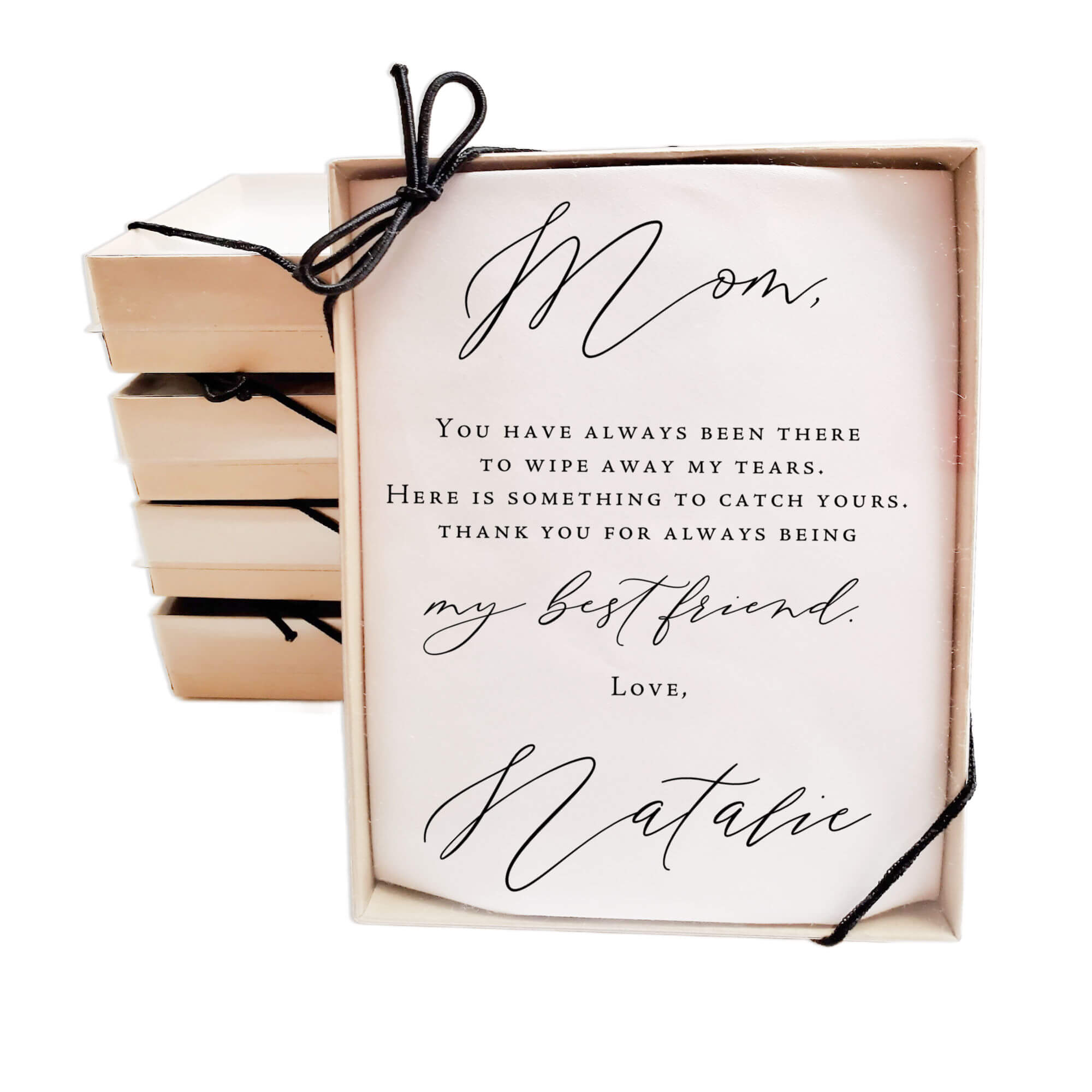 Celebrate your mother on your big day with our one-of-a-kind, personalized handkerchief. A classic design and simple black text make this the perfect wedding gift from daughter to mother. Show your appreciation for all she's done with this timeless token of love.