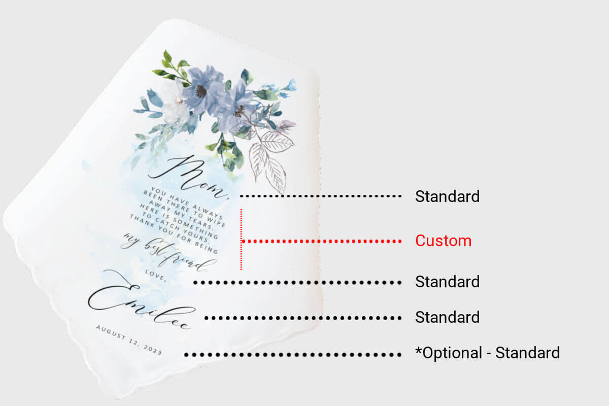 Show your mother of the bride how much she means to you with our wedding gift handkerchief. Beautiful blue and white floral design, personalized with a heartfelt message from the bride. A timeless gift to show your love and gratitude on your special day.