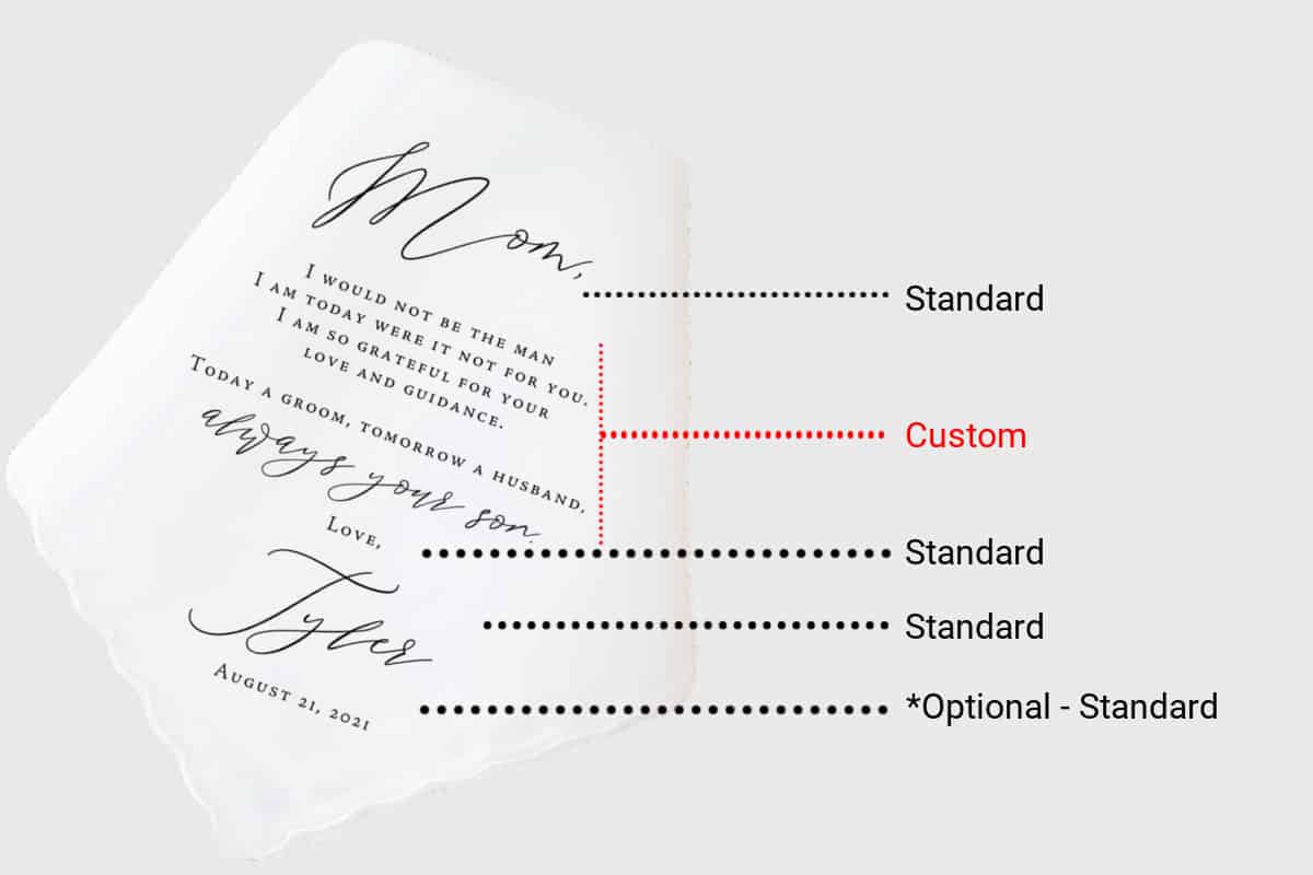 Our Classic Mother of the Groom Handkerchief is a beautiful keepsake designed to express your love and gratitude. Thoughtfully personalized with your name and wedding date, this elegant handkerchief written from the son to his mother serves as a touching reminder of their special bond.